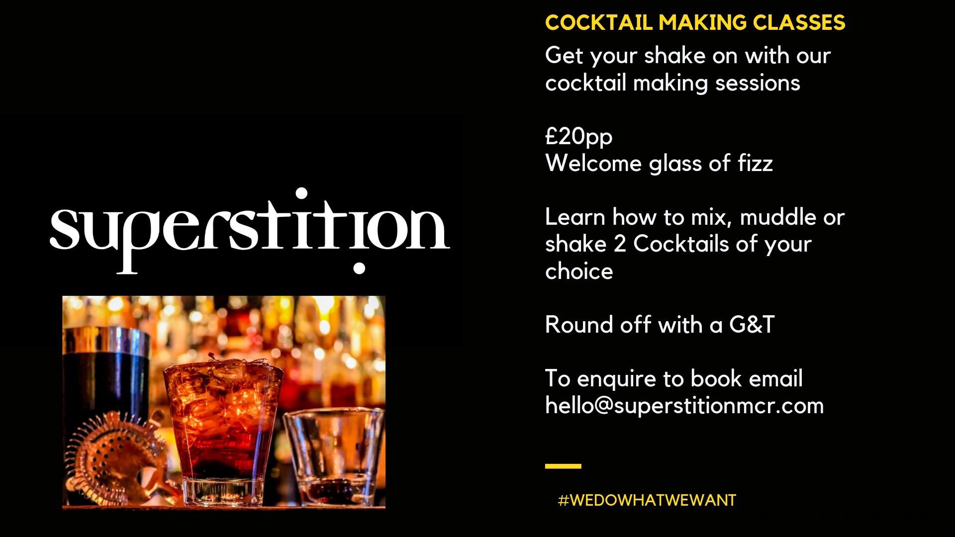 Cocktail making in Manchester Available at all four of our bars in the city our iconic Cocktail Masterclass in Manchester is a one-of-a-kind experience. 90 minutes of competitive cocktail making. Manchester Cocktail Making at Unbeatable Prices - Book Now Pay Later Free Cancellations.